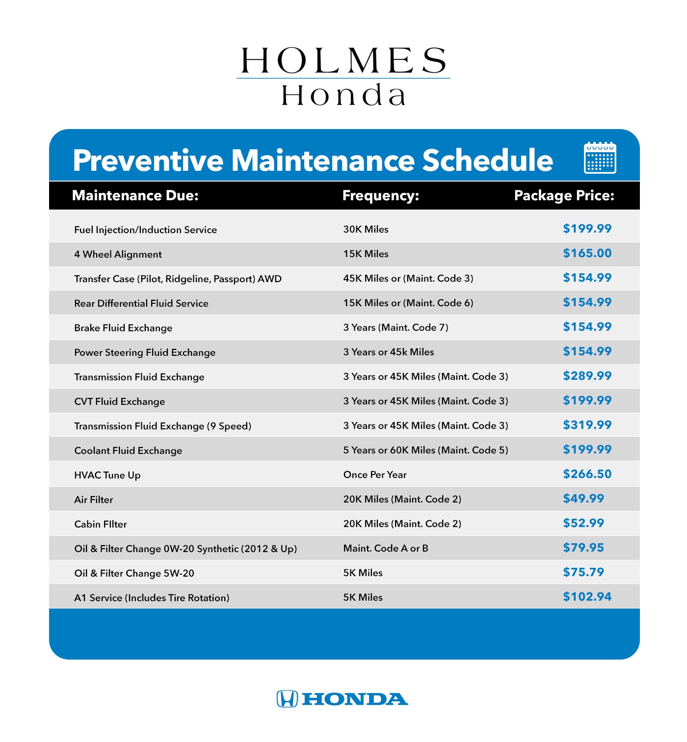 Holmes Honda also has an array of Service Specials to offer our customers! Some of these include oil change coupons, auto butler coupons, executive detail coupons, wheel alignment coupons as well as parts and accessory specials!